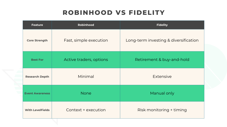 Below is a breakdown of Robinhood vs Fidelity, who each platform is best for, and how pairing either with LevelFields materially improves results.