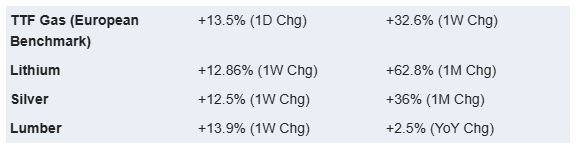 Industrials (XLI) advanced +3.50%, supported by infrastructure, defense, and manufacturing exposure, while Materials (XLB) gained +3.07% on continued strength in commodities and critical-minerals themes. Real Estate (XLRE) added +3.12%, rebounding alongside defensives despite higher-rate headwinds, and Energy (XLE) rose +2.28%, aided by ongoing geopolitical developments and tighter control over Western Hemisphere energy flows.